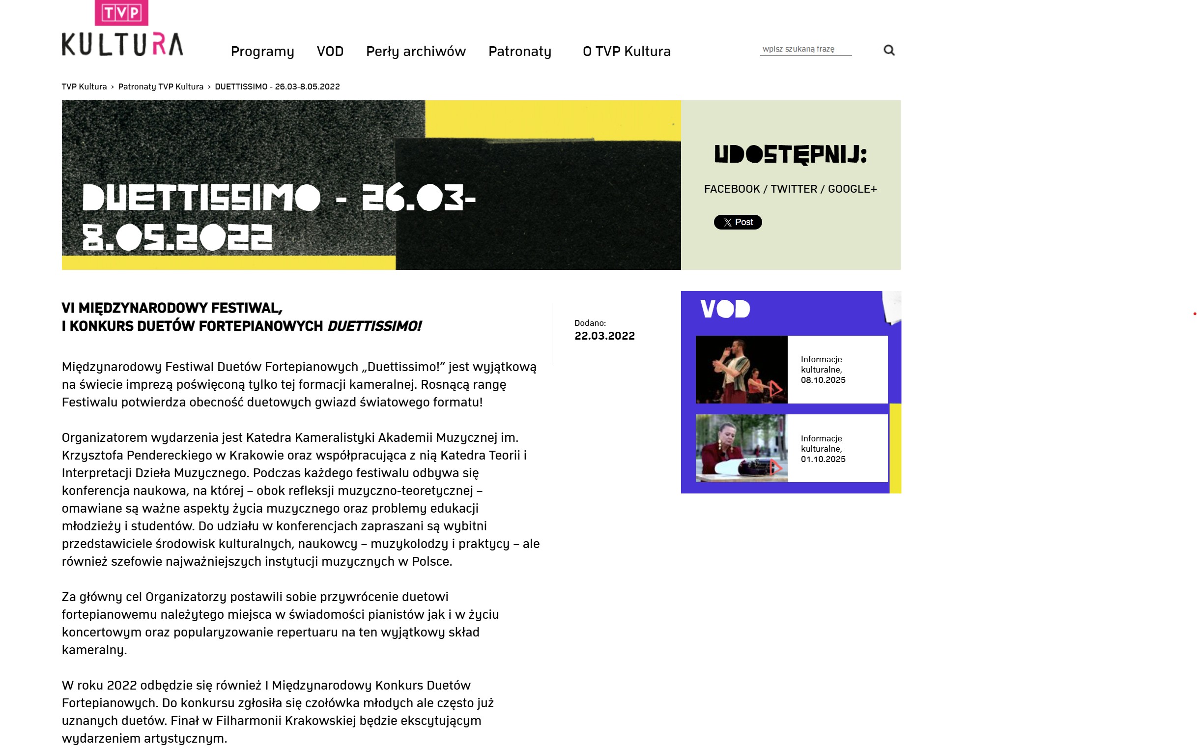 Międzynarodowy Festiwal Duetów Fortepianowych „Duettissimo!” jest wyjątkową na świecie imprezą poświęconą tylko tej formacji kameralnej. O jego randze świadczy obecność duetowych gwiazd światowego formatu, takich jak Stenzl Piano Duo, Genova&Dimitrov Piano Duo, Duo Turgeon, Miroirs Piano Duo, Lutosławski Piano Duo, Ravel Piano Duo, Chopin Piano Duo. Za główny cel swoich działań organizatorzy postawili sobie przywrócenie duetowi fortepianowemu należytego miejsca zarówno w świadomości pianistów, jak i w życiu koncertowym, a także popularyzowanie repertuaru na ten wyjątkowy skład kameralny. W roku 2022 w ramach szóstej edycji festiwalu odbył się również I Międzynarodowy Konkurs Duetów Fortepianowych, do którego zgłosiła się czołówka młodych, ale często już uznanych duetów. Głównym organizatorem przedsięwzięcia jest Katedra Kameralistyki Akademii Muzycznej im. Krzysztofa Pendereckiego w Krakowie, przy współpracy Katedry Teorii i Interpretacji Dzieła Muzycznego. Podczas każdego festiwalu odbywa się też konferencja naukowa o zasięgu ogólnopolskim, a także warsztaty, kursy mistrzowskie prowadzone przez wybitnych pedagogów, koncerty Estrady Młodych oraz koncerty dla dzieci wykonywane przez dzieci.