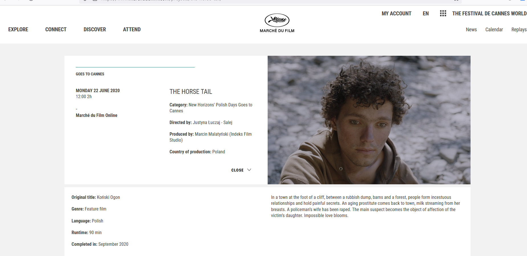 Prezentacja fragmentu pełnometrażowego filmu p.t. Koński ogon (debiut fabularny w postprodukcji) na najbardziej prestiżowych targach filmowych w Europie - Cannes Film Market - Marché du film de Cannes. Projekt był jednym z pięciu filmów reprezentujących Polskę.