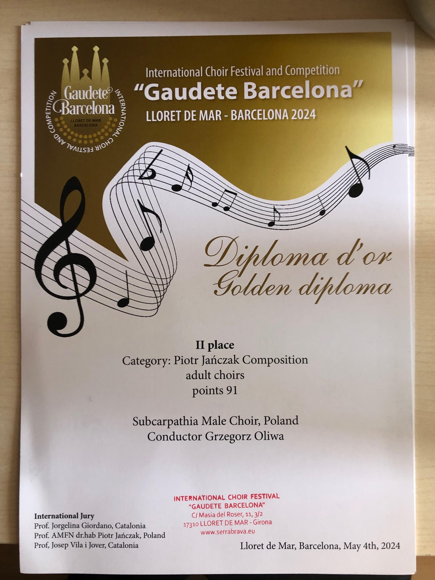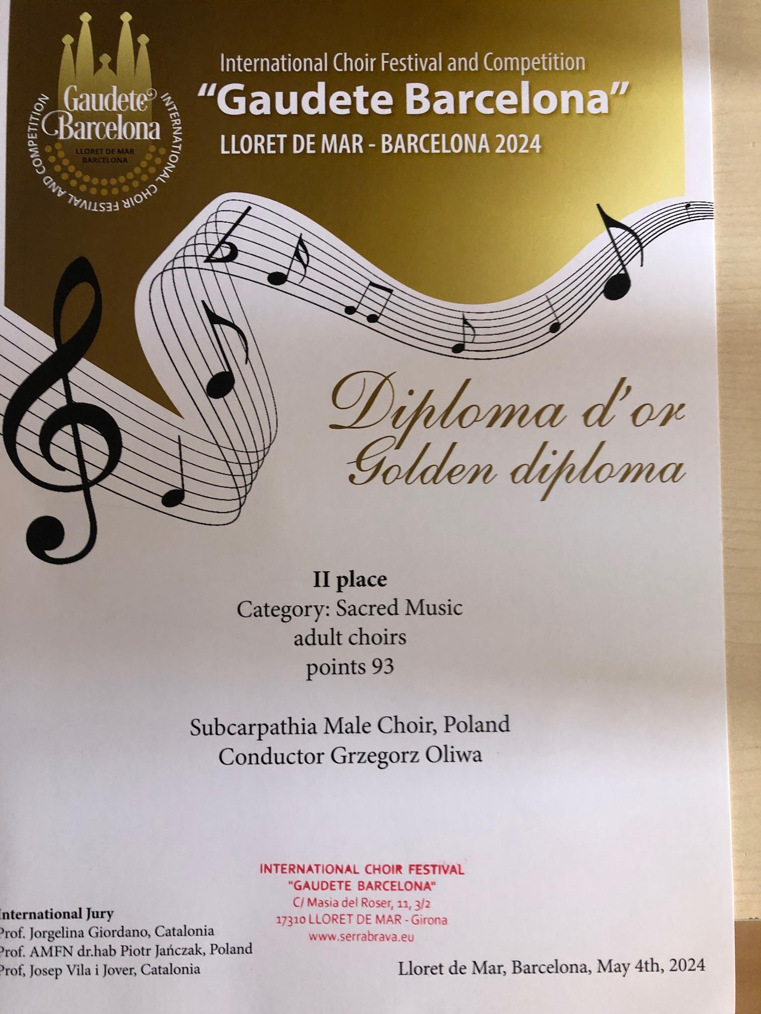 Gaudete Barcelona, Międzynarodowy Festiwal i Konkurs Chóralny "Gaudete Barcelona", konkurs chóralny, Strzyżowski Chór Kameralny, Podkarpacki Chór Męski, Grzegorz Oliwa