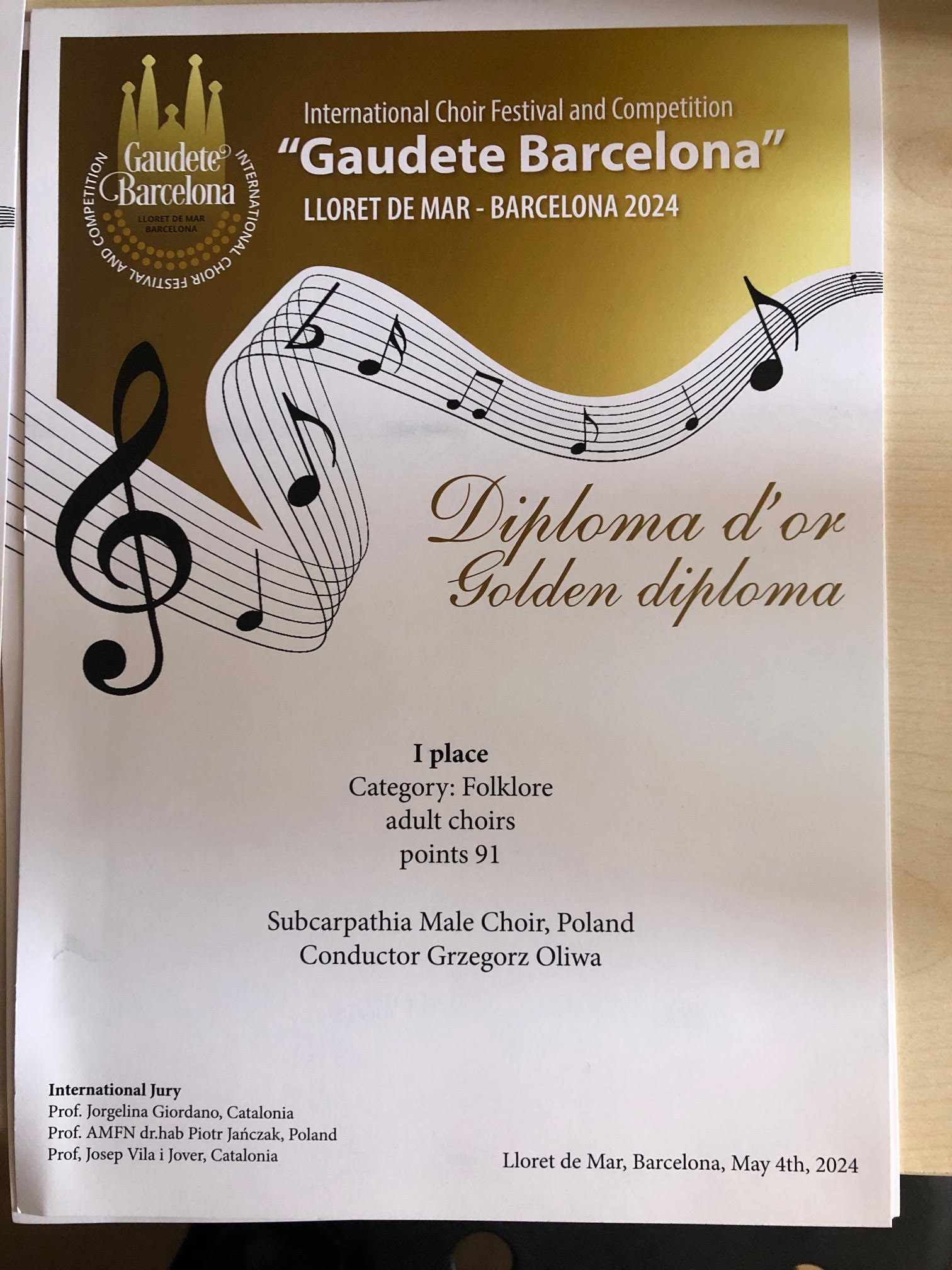 Międzynarodowy Festiwal i Konkurs Chóralny "Gaudete Barcelona" 2024 odbył się w dniach 1-5 maja w Lloret de Mar oraz Barcelonie, w kościele St. Roma. W ramach konkursu chóry rywalizowały o nagrody przed międzynarodowym jury, w skład którego wchodzili: prof. Jorgelina Giordano, prof. AMFN dr. hab. Piotr Jańczak, prof. Josep Vila i Jover.