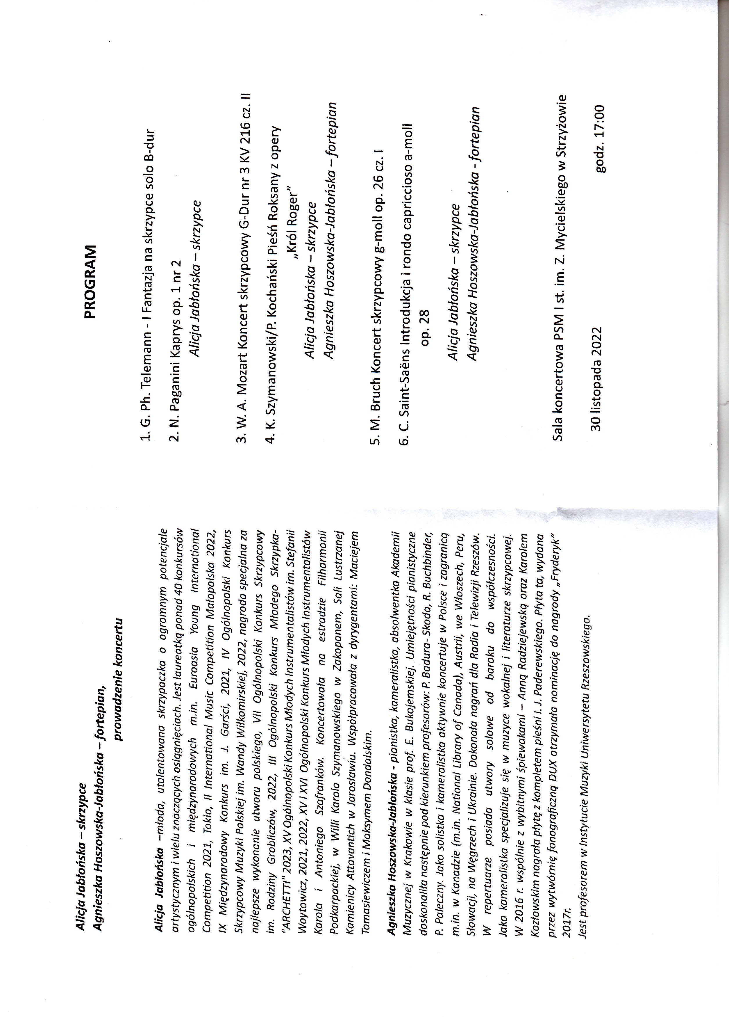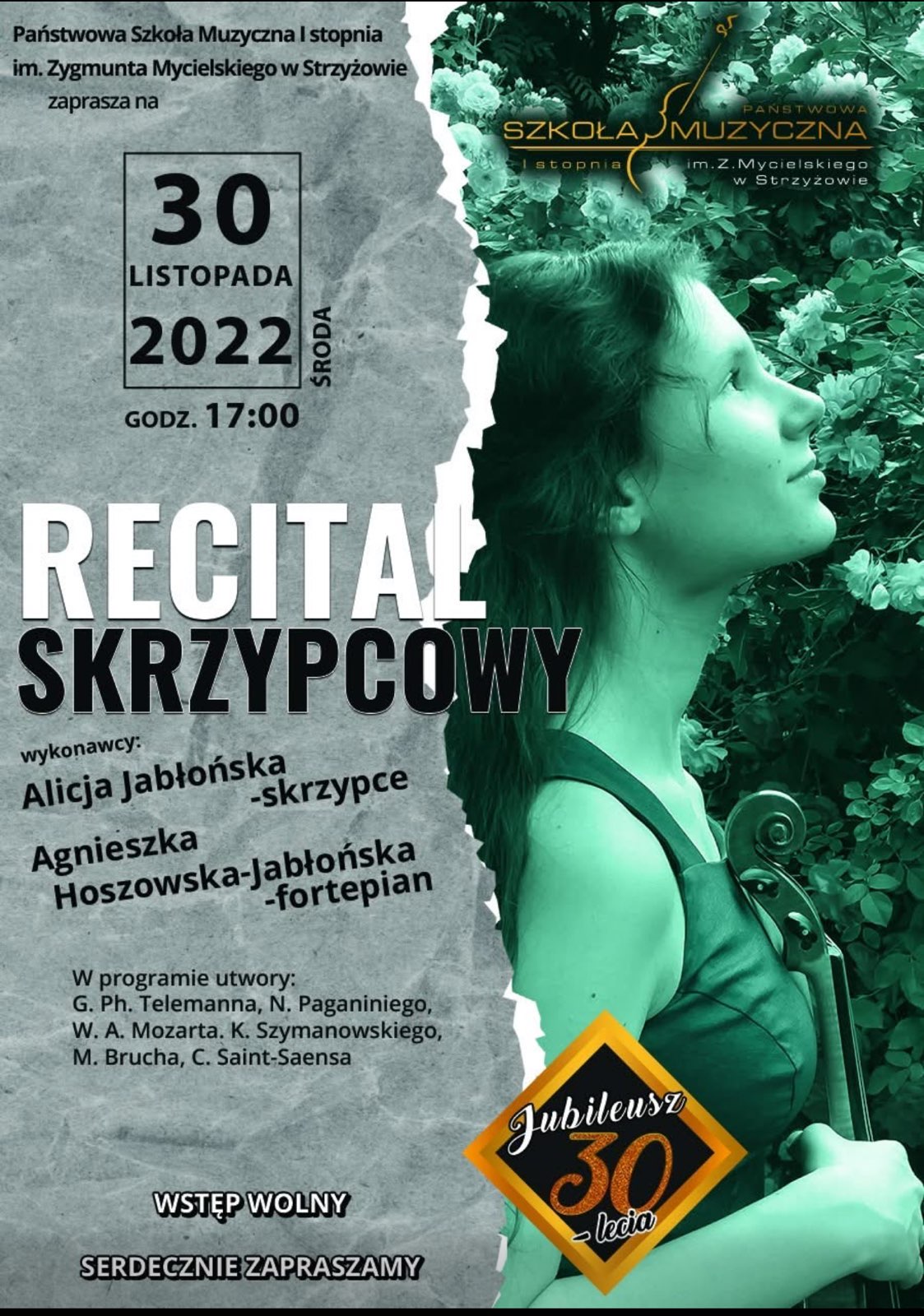 30.11.2022 r. odbył się koncert kameralny w ramach obchodów Jubileuszu 30-lecia Państwowej Szkoły Muzycznej I st. im. Z. Mycielskiego w Strzyżowie. Wykonawcami koncertu były: Alicja Jabłońska – skrzypaczka młodego pokolenia, o wielu sukcesach na konkursach ogólnopolskich i międzynarodowych oraz pianistka, kameralistka, Agnieszka Hoszowska-Jabłońska. Organizatorem koncertu była Państwowa Szkoła Muzyczna I st, im. Z. Mycielskiego w Strzyżowie. Koncert wykonany został w nowo otwartej, nowoczesnej sali koncertowej szkoły. Przekrojowy program występu obejmował zarówno solowe utwory skrzypcowe G. Ph. Telemanna czy N. Paganiniego, jak również utwory skrzypcowe z fortepianem W. A. Mozarta, M. Brucha, K. Szymanowskiego czy C. Saint- Saënsa.