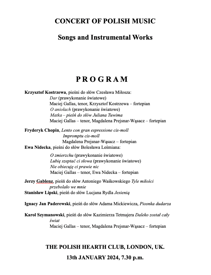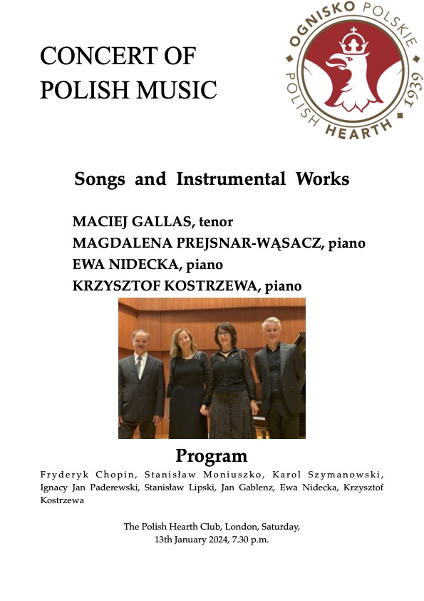13 stycznia 2024 roku profesorowie Instytutu Muzyki Uniwersytetu Rzeszowskiego wykonali koncert pt.: "Concert of Polish Music – Songs and Instrumental Works" w przepięknej i prestiżowej sali koncertowej "Ogniska polskiego" (THE POLISH HEARTH CLUB) w Londynie. Partię fortepianu (solo i akompaniament) wykonywała dr hab. Magdalena Prejsnar-Wąsacz. Licznie zgromadzona na koncercie publiczność miała sposobność wysłuchać polskiej muzyki romantycznej oraz najnowszych kompozycji Ewy Nideckiej i Krzysztofa Kostrzewy. W czasie koncertu zabrzmiały prawykonania pieśni. Aby zaspokoić gusta miłośników muzyki romantycznej, podczas koncertu wykonane zostały również utwory m.in. Chopina, Paderewskiego i Szymanowskiego.
