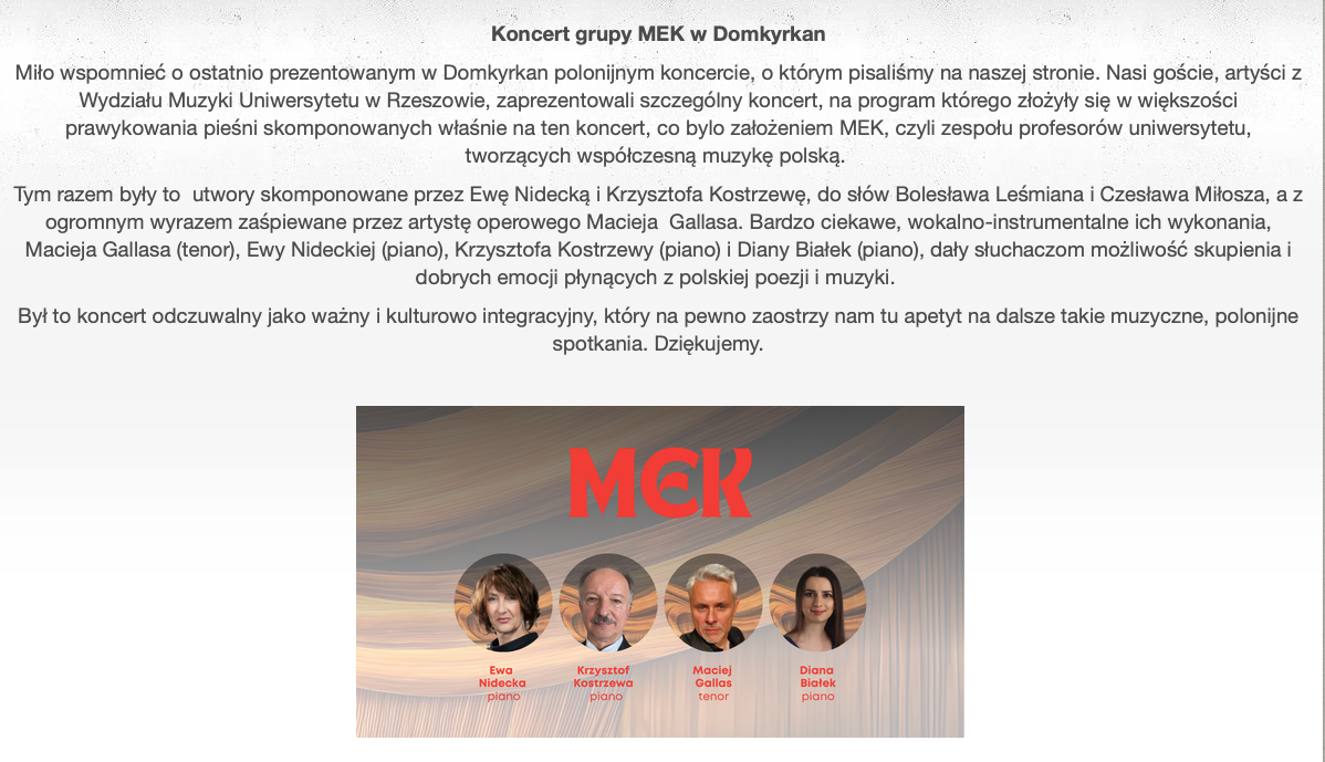 W sobotę 14 lutego 2026 r. miał miejsce koncert „Musica Romantica – Musica Moderna” w wykonaniu grupy „MEK – Ensemble” w składzie: Maciej Gallas – tenor, Ewa Nidecka – kompozycja, fortepian i Krzysztof Kostrzewa – kompozycja, fortepian. Gościnnie wystąpiła również pianistka z Krakowa – Diana Białek. Program obejmował utwory fortepianowe A. Dvoraka, W. Kacperskiego, G. Faure. Maciej Gallas wykonał arię Giuseppe Verdiego "La donna e mobile" z opery "Rigoletto" oraz pieśni współczesnych kompozytorów – Ewy Nideckiej i Krzysztofa Kostrzewy. Współorganizatorem koncertu był prof. Wojciech Głuch- kompozytor, pianista i wykładowca akademicki mieszkający w Szwecji od ponad dwudziestu pięciu lat.