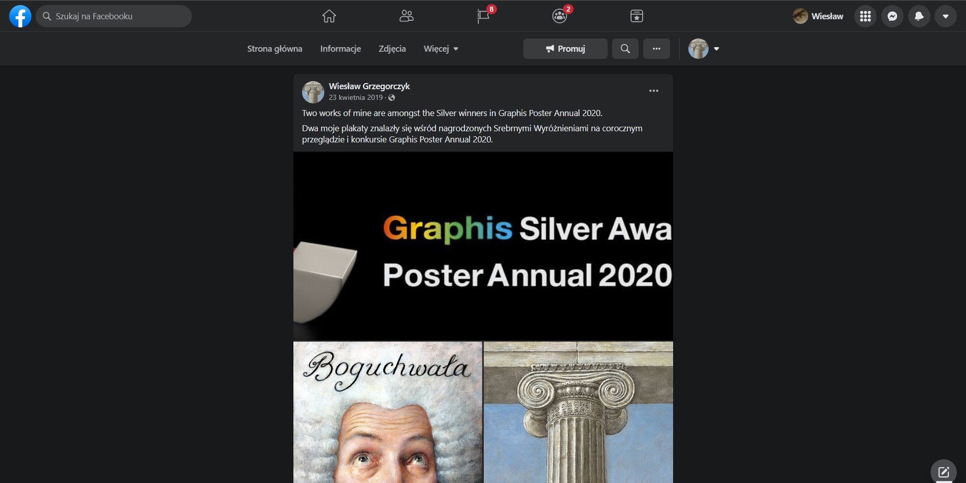 Plakat Wiesława Grzegorczyka pt. „Plakaty malowane i drukowane” otrzymał nagrodę „Silver Award” w prestiżowym konkursie „Graphis Poster Annual 2020”.