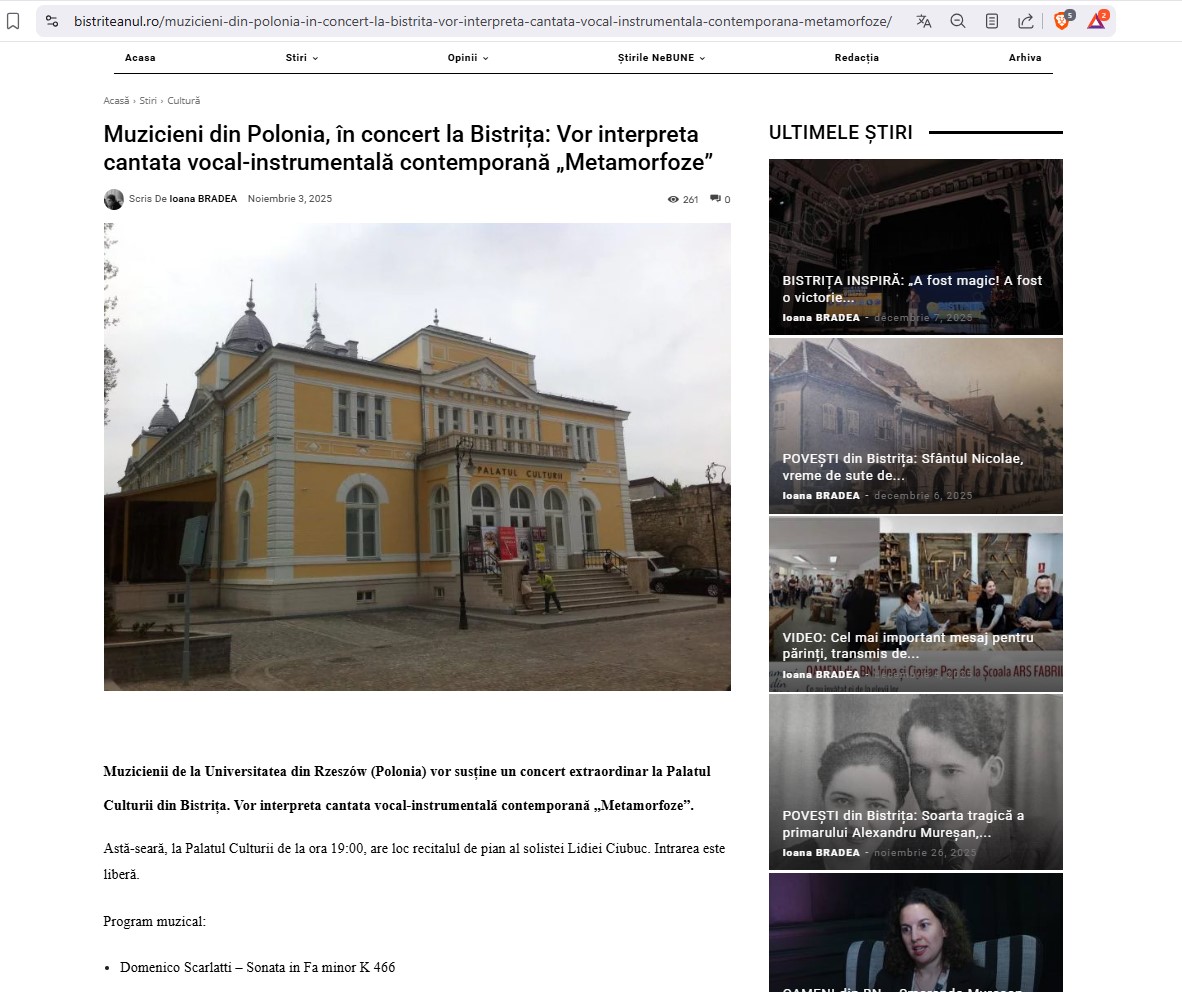 | dc.description | W listopadzie 2025 roku została zrealizowana międzynarodowa trasa koncertowa „Metamorfozy”, obejmująca występy na terenie Węgier, Rumunii oraz Słowacji, a także koncert finałowy w Polsce. Za przygotowanie zespołów wykonawczych oraz dyrygenturę odpowiadała dr hab. prof. UR Anna Marek-Kamińska, pełniąca funkcję kierownika artystycznego przedsięwzięcia. Centralnym punktem programu wszystkich koncertów była kantata wokalno-instrumentalna Dominika Lasoty „Metamorfozy”, stanowiąca spójną oś ideową i artystyczną całej trasy. Miejsca i daty koncertów zagranicznych: • Budapeszt (Węgry) – 8 listopada 2025 Polskie Stowarzyszenie Kulturalne im. J. Bema (prawykonanie utworu) • Satu Mare (Rumunia) – 9 listopada 2025 Filarmonica de Stat „Dinu Lipatti” • Bystrzyca / Bistrița (Rumunia) – 10 listopada 2025 Palatul Culturii Bistrița • Koszyce (Słowacja) – 12 listopada 2025 Konzervatórium Jozefa Adamoviča oraz Konzervatórium Petra Dvorského Publiczność we wszystkich ośrodkach przyjęła koncerty z wyjątkowym entuzjazmem – zarówno środowiska polonijne, jak i lokalni melomani oraz młodzi adepci sztuki muzycznej związani z konserwatoriami i instytucjami kultury. 22 listopada 2025 roku odbył się finał międzynarodowej trasy koncertowej „Metamorfozy” w Sali Koncertowej Zamku Kazimierzowskiego w Przemyślu, który stanowił podsumowanie całego cyklu wydarzeń. Wykonawcy: Orkiestra ArtEnsemble Resovia, Zespół Wokalny Studenckiego Koła Naukowo-Artystycznego Dyrygentury Chóralnej Wydziału Muzyki UR, prof. dr hab. Jacek Ścibor – tenor solo, dr hab. prof. UR Anna Marek-Kamińska - dyrygent „ Metamorfozy” Dominika Lasoty to 16- częściowa kantata. Kompozytor nadał oryginalność swemu dziełu poprzez eksperymentalne podejście zarówno do brzmienia oraz formy, z naciskiem na dialog między głosem solowym a pozostałymi wykonawcami. Dominik Lasota swoją kompozycję oparł na fragmentach tekstów poematu epickiego, napisanego przez rzymskiego poetę Owidiusza przedstawiającego przy pomocy wątków mitologii greckiej i rzymskiej stworzenie i historię świata. Znaczenie artystyczne projektu: Międzynarodowa trasa koncertowa „Metamorfozy”: • stanowiła istotne osiągnięcie artystyczne o zasięgu międzynarodowym, • promowała współczesną polską twórczość kompozytorską, • wzmacniała pozycję Uniwersytetu Rzeszowskiego na arenie europejskiej, • integrowała środowiska akademickie i artystyczne Europy Środkowo-Wschodniej, Projekt odbył się dzięki grantowi przyznanemu przez Rektora Uniwersytetu Rzeszowskiego. | |