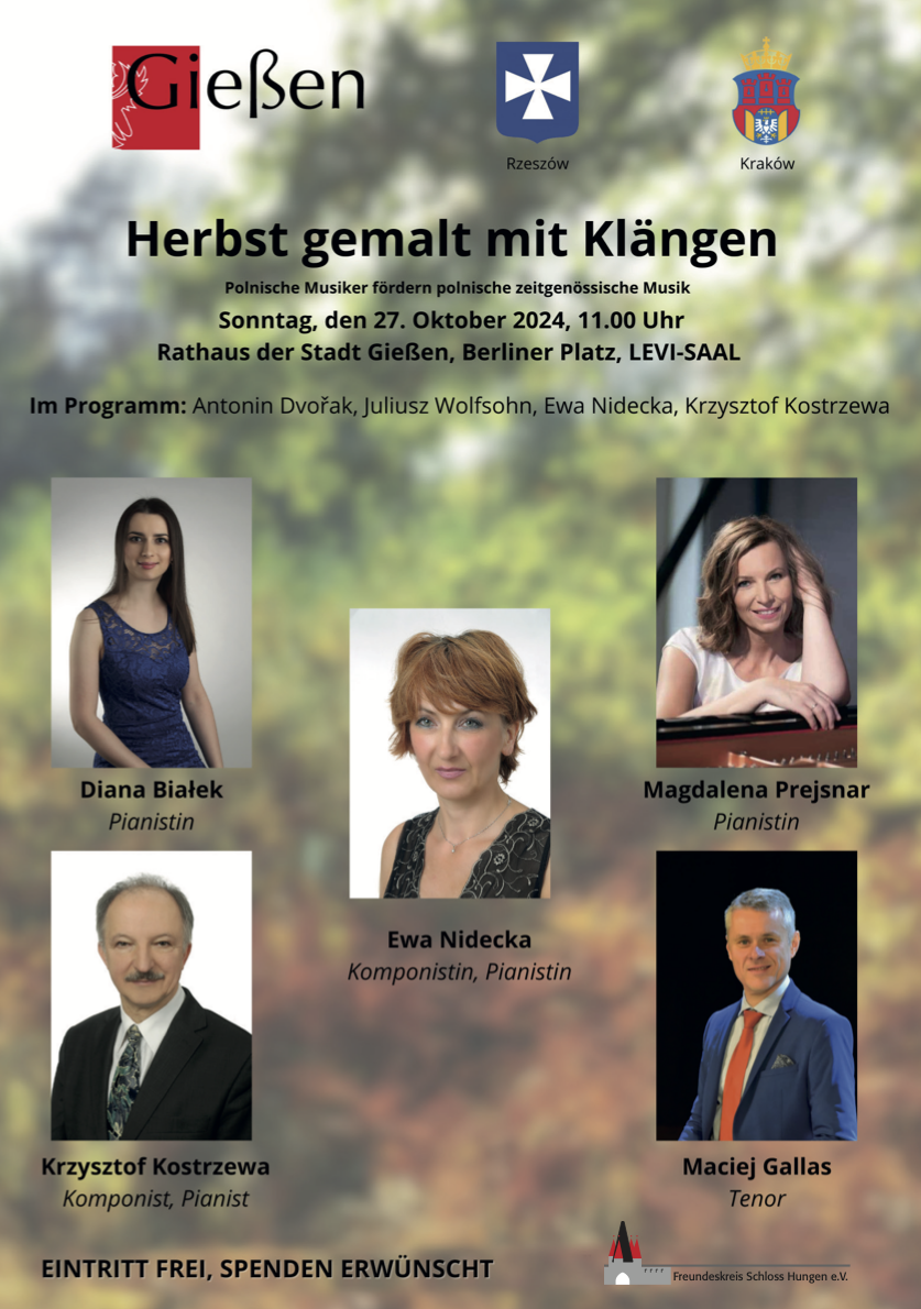 27 października 2024 r. grupa profesorów z Wydziału Muzyki Uniwersytetu Rzeszowskiego w składzie: prof. dr hab. Maciej Gallas- tenor, dr hab., prof. UR Magdalena Prejsnar-Wąsacz- fortepian, dr hab., prof. UR Ewa Nidecka- fortepian, dr hab., prof. UR Krzysztof Kostrzewa- fortepian, wystąpiła na koncercie w Niemczech w mieście Gießen (Hesja). Koncert zatytułowany „Herbst gemalt mit Klängen” („Jesień dźwiękami malowana”) odbył się w prestiżowej LEVI-SAAL Rathaus der Stadt Gießen (Ratusz miejski). Zróżnicowany program, obejmował utwory fortepianowe A. Dvořáka, J. Wolfsohna oraz pieśni i utwory współczesnych kompozytorów: Ewy Nideckiej i Krzysztofa Kostrzewy. Program: -A. Dvořak – "Tańce słowiańskie" na fortepian (na cztery ręce) op. 72 nr 2, op. 46 nr 7 wyk.: M. Prejsnar-Wąsacz, M. Białek /gościnnie/, fortepian -K. Kostrzewa – "Dar", wyk.: M. Gallas- tenor, K. Kostrzewa- fortepian -K. Kostrzewa – "Die Worte des Engels", prawykonanie: M. Gallas- tenor, K. Kostrzewa- fortepian -K. Kostrzewa – "Liebeslied", wyk.: M. Gallas- tenor, M. Prejsnar-Wąsacz- fortepian -K. Kostrzewa – "Ogrodnik", prawykonanie: M. Gallas- tenor, M. Prejsnar-Wąsacz- fortepian -J. Wolfsohn – Parafraza "Mahlzeitslied" -E. Nidecka – "Po śmierci", prawykonanie: M. Gallas- tenor, E. Nidecka- fortepian -E. Nidecka – "Ocean łez" na fortepian, prawykonanie: E. Nidecka- fortepian -E. Nidecka – "O zmierzchu", wyk.: M. Gallas- tenor, E. Nidecka- fortepian -E. Nidecka – "Lubię szeptać ci słowa", wyk.: M. Gallas- tenor, E. Nidecka- fortepian W repertuarze koncertu znalazły się światowe prawykonania pieśni: Krzysztofa Kostrzewy – "Ogrodnik" – do sł. Cz. Miłosza oraz "Liebeslied" i "Die Worte des Engels" – obydwie do sł. R.M. Rilkego oraz Ewy Nideckiej "Po śmierci" (do sł. B. Leśmiana), a także utwór na fortepian "Ocean łez". Koncert okazał się wydarzeniem bardzo dobrze przyjętym przez społeczność lokalną oraz władze miasta Gießen (wśród publiczności byli również przedstawiciele Polonii). W lokalnej prasie ukazało się kilka niezwykle pozytywnych recenzji, zwracających uwagę na wysoką jakość wykonania utworów oraz ich wartość kompozytorską. Recenzent Sascha Jouini w gazecie „Gießener Allgemeine” z 29 października 2024 r. zauważył, że „w pieśni Krzysztofa Kostrzewy "Liebeslied" do słów R.M. Rilkego więź duchowa kontrastowała z chęcią ukrycia miłości, a Maciej Gallas, znany z nagrań dla radia i telewizji, śpiewał z inspiracją i wydobywał z muzyki delikatne niuanse”. W kolejnej pieśni Kostrzewy "Ogrodnik" autor recenzji zauważył, „że partia fortepianu była zredukowana do minimum, natomiast dominował głęboki, poważny śpiew”. Dwie pieśni E. Nideckiej do słów B. Leśmiana "O zmierzchu" i "Lubię szeptać ci słowa" określił jako „bogatą nastrojową muzykę, otwierającą pole dla najgłębszych uczuć”. Inny recenzent, Heiner Schultz, w gazecie „Gießener Anzeiger” z 30 października 2024 r. wysoko ocenił „kunszt i wiedzę wykonawców”. Recenzent określił głos Macieja Gallasa jako „precyzyjny, mocny i jednocześnie naturalny”; fortepianowy akompaniament Krzysztofa Kostrzewy w autorskiej pieśni "Dar" opisał jako „opływający głos solisty z precyzją i wyczuciem”. W dalszym ciągu swej recenzji H. Schultz stwierdził, że „pianistka Ewa Nidecka również błyszczała nieskazitelnym kunsztem i wspaniałym wyczuciem”, a jej wykonanie na fortepianie własnej kompozycji "Ocean łez" ocenił jako „z wyczuciem opowiedzianą historię”. Dwie pieśni Ewy Nideckiej do słów B. Leśmiana, które zamykały koncert w Gießen ("O zmierzchu" i "Lubię szeptać ci słowa") recenzent opisał jako „muzykę atrakcyjną i znakomicie zrealizowaną”. Publiczność nagrodziła wykonawców gromkimi brawami za koncert, który, jak to określono, był „perfekcyjnie przygotowany i wykonany z wielkim sercem”.