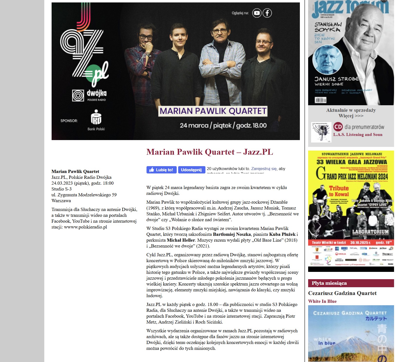 Koncert combo jazzowego Marian Pawlik Quartet z cyklu Jazz.pl odbył się 24 marca 2024 r. w renomowanym Studio Koncertowym S3 Polskiego Radia w Warszawie i transmitowany był na żywo na antenie Programu 2 Polskiego Radia i w Internecie (transmisja wideo) na portalach Facebook, YouTube i na stronie internetowej stacji. Marian Pawlik Quartet to zespół założony przez basistę i lutnika Mariana Pawlika, który współtworzą: saksofonista Bartłomiej Noszka, pianista Kuba Płużek i perkusista Michał Heller. Muzycy razem wydali płyty "Old Base Line" (2018) i "Bezsenność we dwoje" (2021).