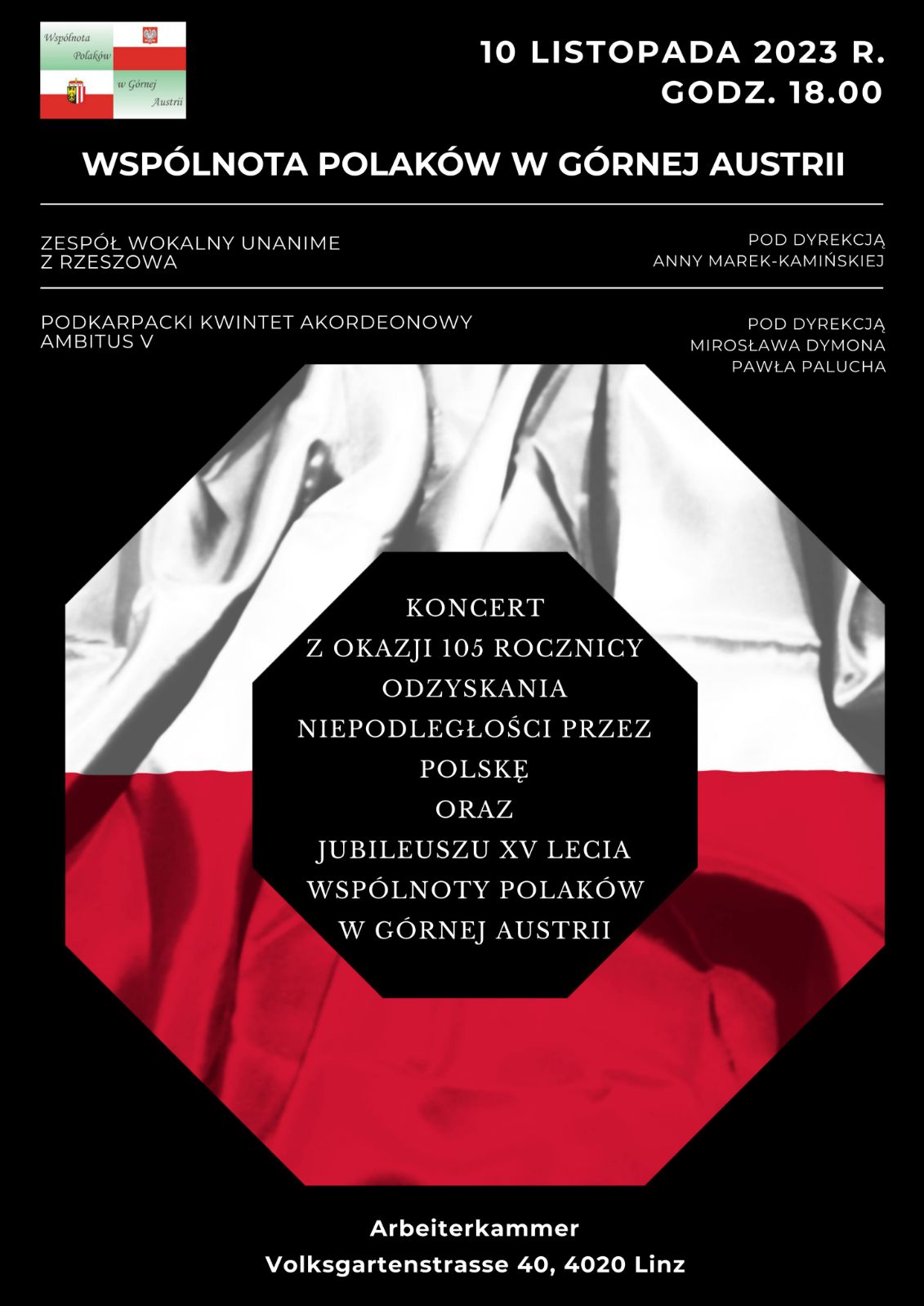 10 listopada 2023 r. w Linz w Austrii odbył się koncert Podkarpackiego Kwintetu Akordeonowego Ambitus V pod dyrekcją Mirosława Dymona, z okazji 105. rocznicy odzyskania niepodległości przez Polskę i 15. rocznicy istnienia Wspólnoty Polaków w Górnej Austrii. Kwintet w składzie: Paweł Paluch, Tomasz Blicharz, Weronika Sura, Mariusz Siuśta, Mirosław Dymon, wykonał utwory kompozytorów polskich: Tomasza Kiesewettera, Michała Kleofasa Ogińskiego, Bronisława Kazimierza Przybylskiego, a także Roberta Schumanna, Ferenca Farkasa i Leona Boellmanna. Współwykonawcami koncertu był zespół wokalny „Unanime” pod dyrekcją Anny Marek – Kamińskiej. Oprócz polskiej społeczności z Górnej Austrii w uroczystości wzięli udział także zaproszeni goście: konsul Ambasady RP w Austrii Grażyna Karubin, prezes Izby Pracy Górnej Austrii Andreas Stangl, przedstawicielka związków zawodowych Sanja Sovic, przedstawicielka Biura Integracji Miasta Linz Daniel Höllinger, przewodnicząca Rady Doradczej ds. Migracji i Integracji w Linzu Krisztina Balint.