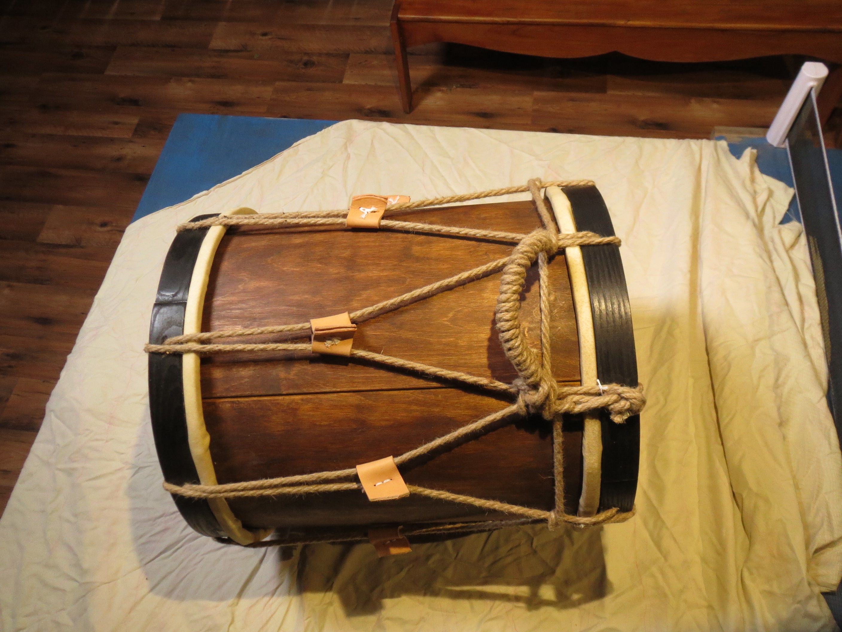 1. bębna renesansowego – korpus instrumentu wykonany z warstwowo klejonego obłogu brzozowego barwionego i wykończonego naturalnymi olejami i woskiem. Jako membrany została użyta kozia skóra o dwóch grubościach – grubsza na membranę wierzchnią oraz cieńsza na dolną – rezonansową. Membrany zostały nałożone na system podwójnych jesionowych obręczy napinanych konopnymi sznurami. Dodatkowo naciąg jest regulowany za pomocą skórzanych napinaczy na sznurach. Struna werblowa wykonana z jelita baraniego napięta na dolnej membranie dodaje charakterystycznego pobrzęku w brzmieniu instrumentu.