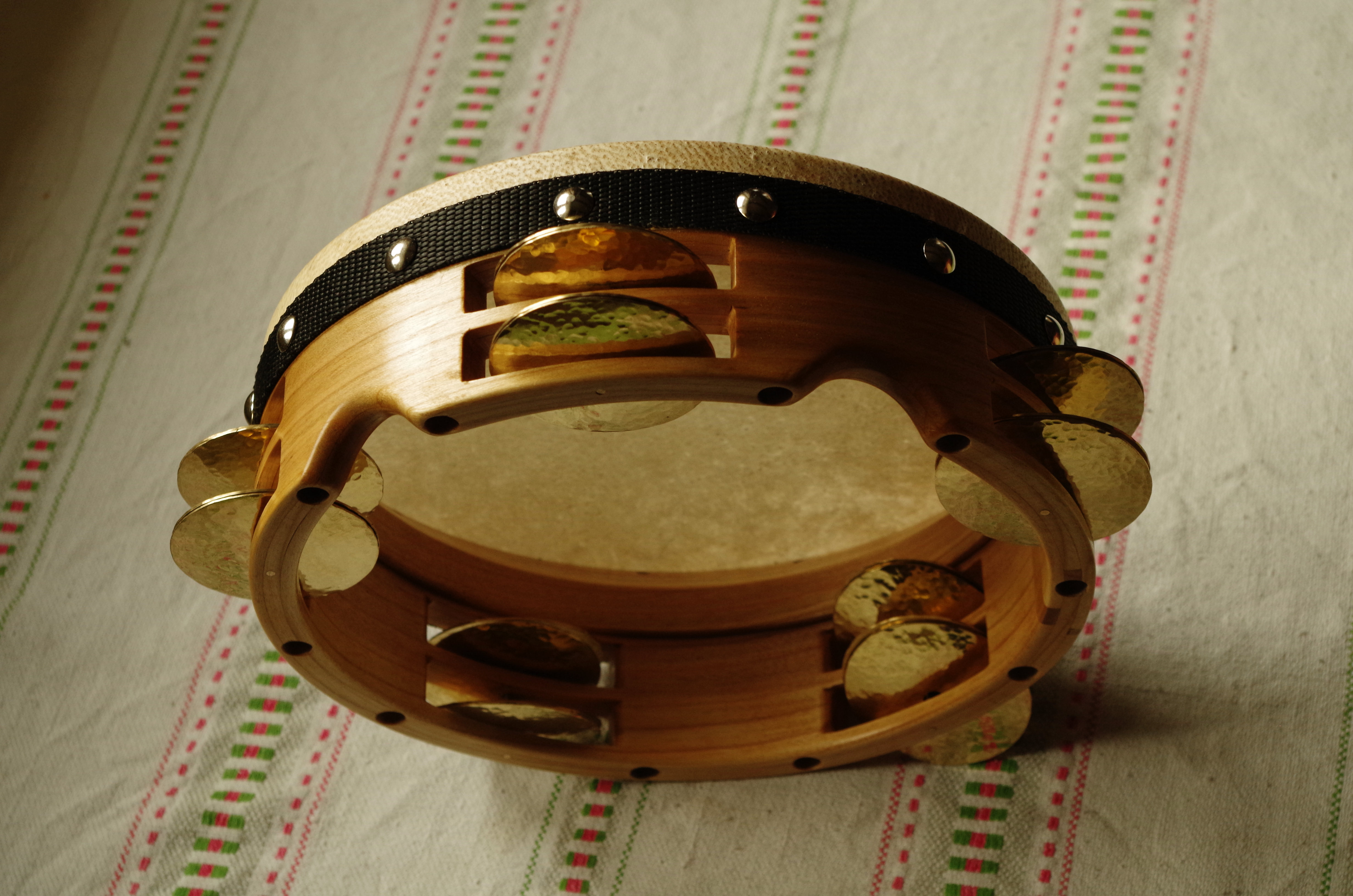 2. tamburyn – mały bęben obręczowy inspirowany bliskowschodnim riqq. Korpus z warstwowo klejonego drewna czereśni złożony z dwóch połączonych obręczy z wewnętrznym mechanizmem śrubowym umożliwiającym regulację napięcia membrany wykonanej z najcieńszej skóry koziej. Pięć par brzękadeł (blaszek) wykonanych z mosiądzu przez ręczne wykuwanie daje wysokie, jasne i bardzo nośne brzmienie.