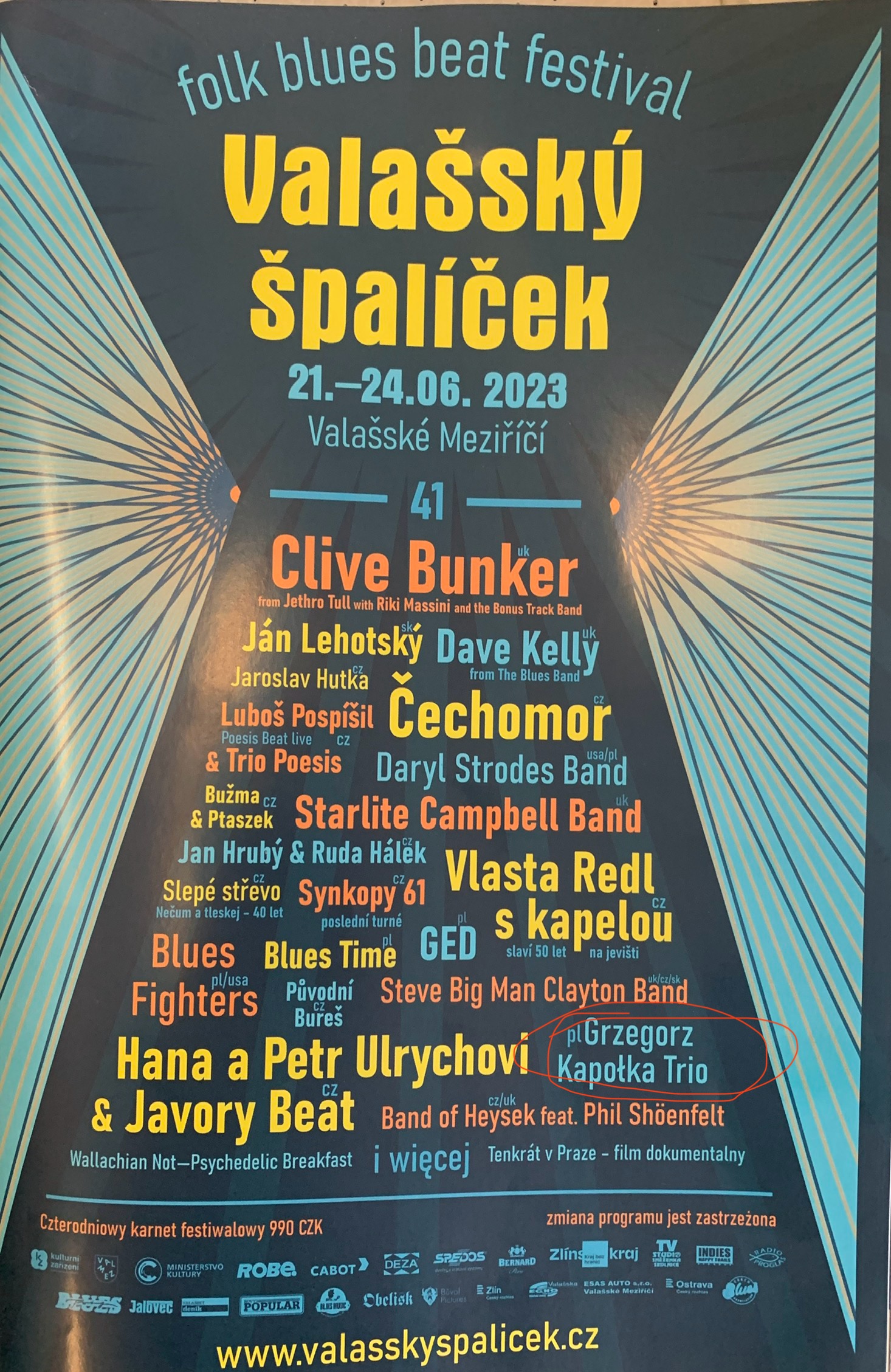 Koncert Grzegorz Kapołka Trio – koncert na międzynarodowym festiwalu „Folk, Blues & Beat Festiwal Valašsky Špaliček”, 24.06.2023r. Miejsce zamek Zerotinu, Valašske Meziriči, scena główna, Czechy.