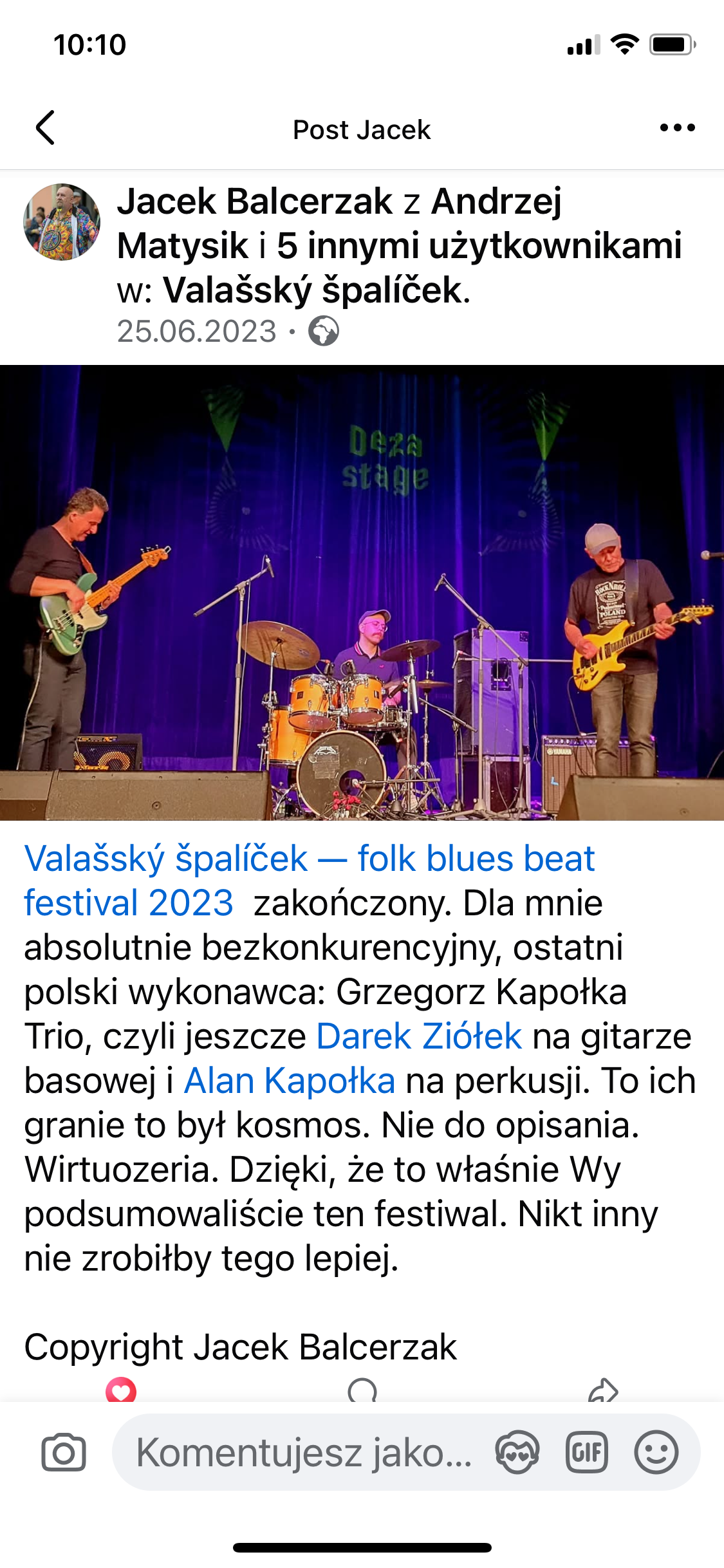 2023-06-24 Międzynarodowy Festiwal Folk, Blues & Beat Festiwal Valašsky Špaliček, koncert Grzegorz Kapołka Trio/ partia gitary basowej, kompozytor