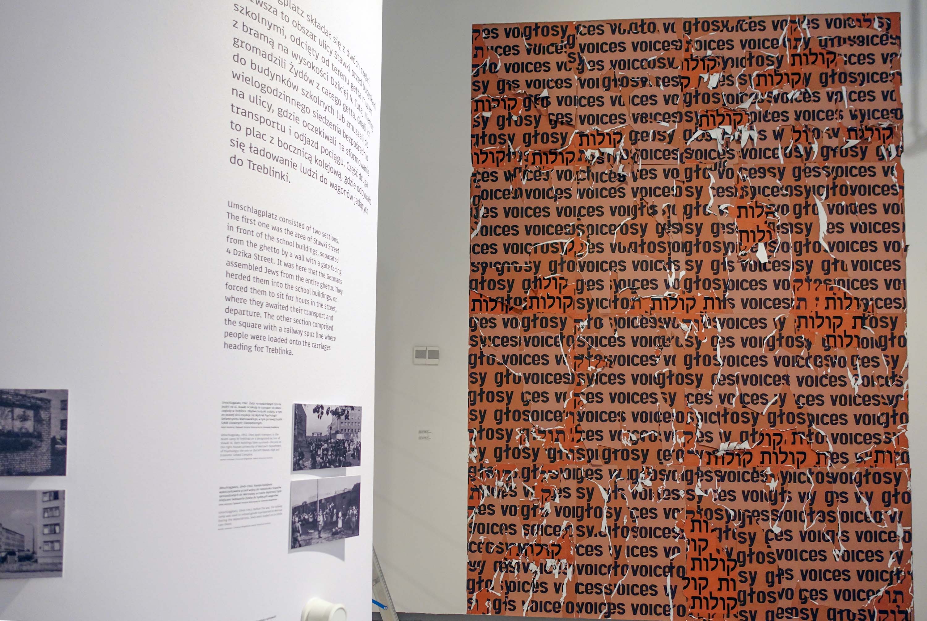 Koyles, Głosy, Voices, instalacja tekstowa, wielkoformatowy druk cyfrowy, kolaż, 400 x 350 cm, na wystawie "Tu Muranów" w Muzeum Historii Żydów Polskich, Polin w Warszawie, 26.06.2020