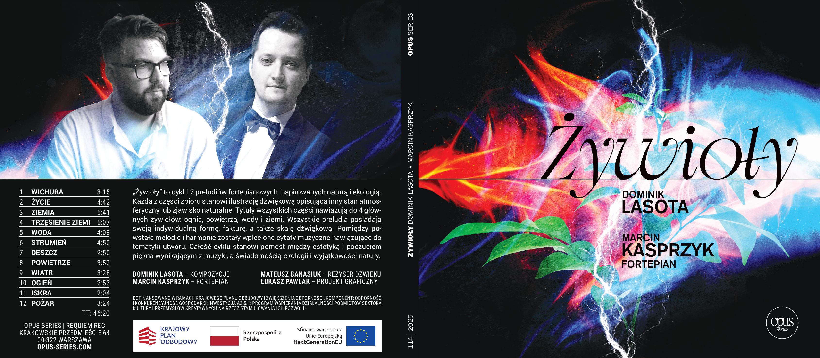 Wydana w 2025 r. płyta CD „Żywioły” zawiera cykl 12 preludiów fortepianowych autorstwa Dominika Lasoty w wykonaniu Marcina Kasprzyka (fortepian). To współczesna muzyczna opowieść o sile natury, jej kruchości i zmienności. Kompozytor, inspirując się ekologią oraz symboliką czterech żywiołów, tworzy dźwiękowy świat, w którym elementarne siły przyrody spotykają się z refleksją nad odpowiedzialnością człowieka za środowisko. Każde preludium posiada własny charakter i barwę – od subtelnych obrazów wodnych po surowe, pulsujące motywy ognia czy dynamikę powietrza i ziemi. Płytę wydało wydawnictwo Requiem Records.